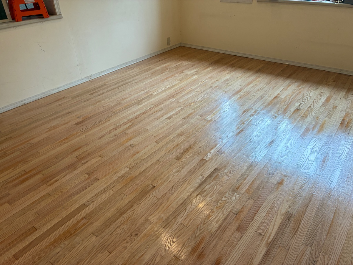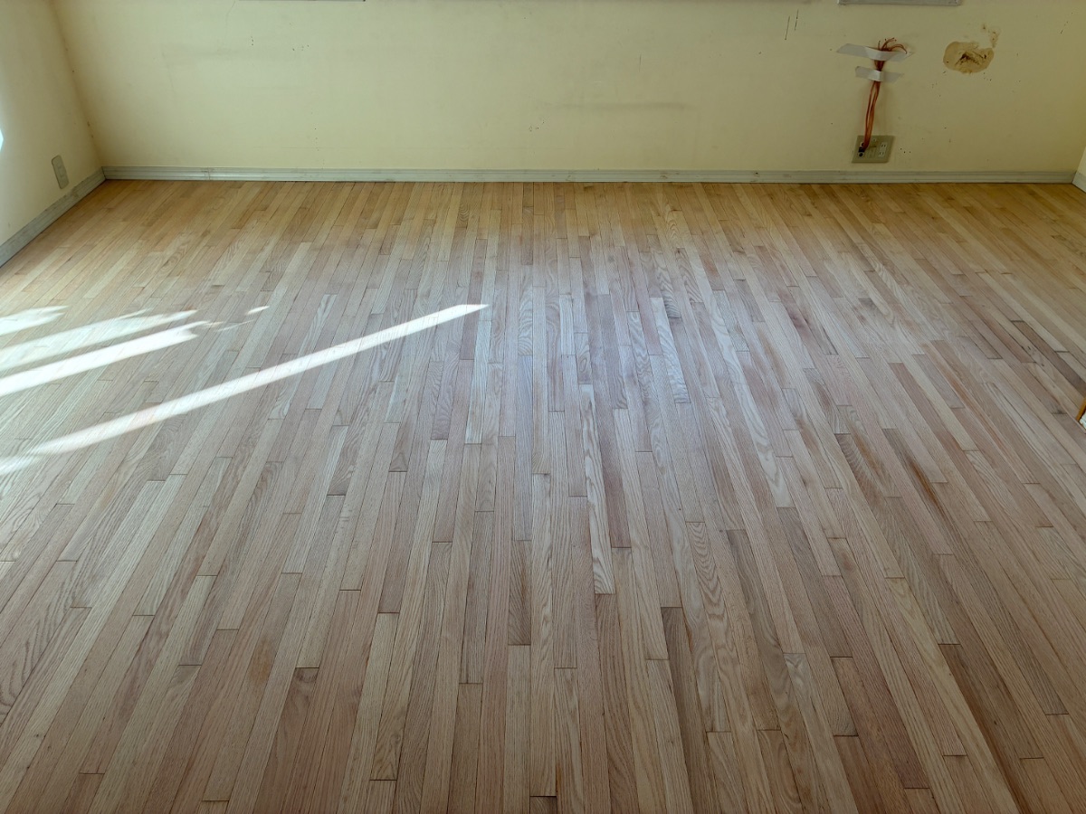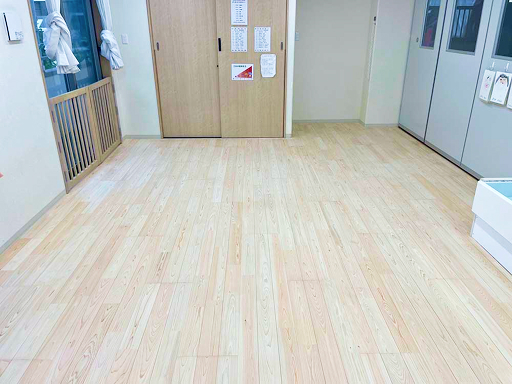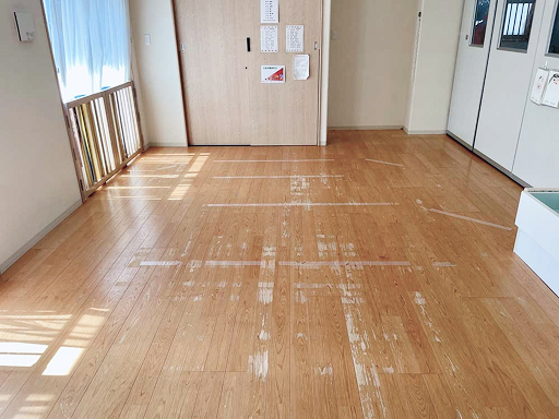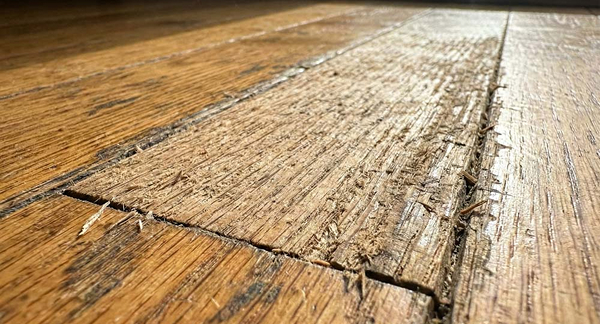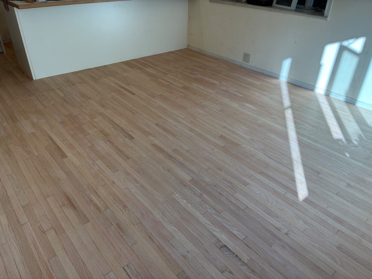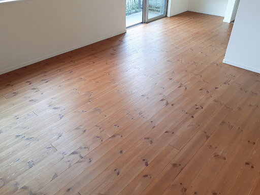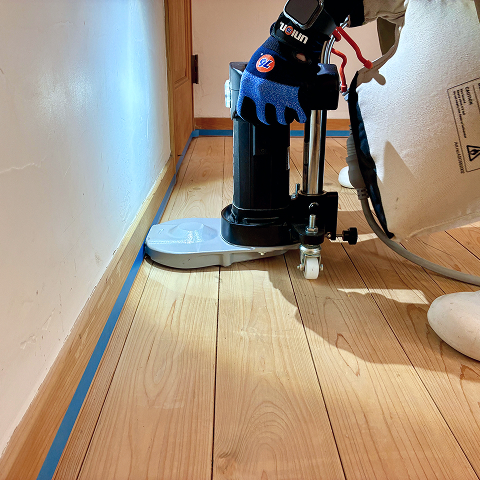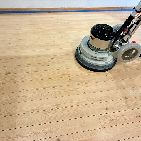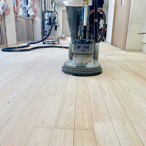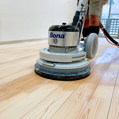 古い塗膜や深い傷・シミを削り取り、フローリングの素地(白木の状態)を露出させます。