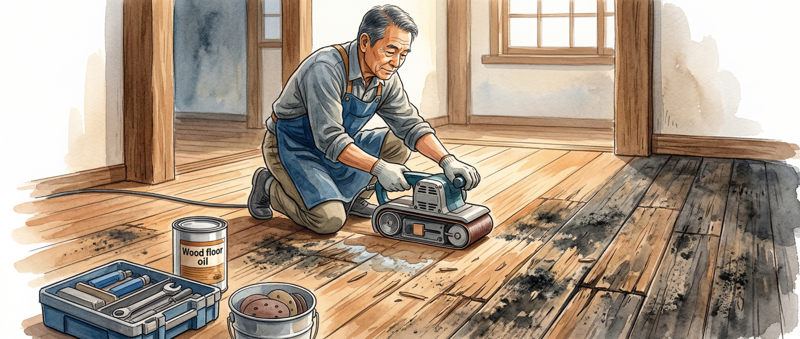 無垢フローリングの黒ずみ・ささくれを削り直しで解決|DIYの手順からプロの床研磨まで